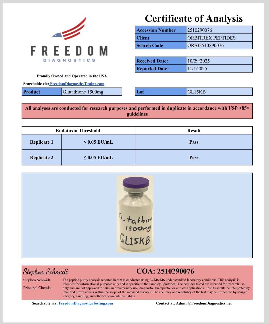 Glutathione 1500mg is supplied strictly for laboratory research purposes only. It is not intended for human consumption, medical use, or veterinary application. All handling and research must follow institutional laboratory protocols and applicable regulations.