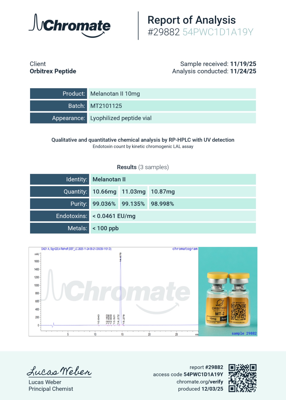 Whether you are a researcher working independently or part of a larger institution, MT-II offers the purity, documentation, and logistical support you need. With Orbitrex Peptides, you can rest assured that every product is handled with the utmost care, tested with uncompromising standards, and delivered with efficiency in mind.